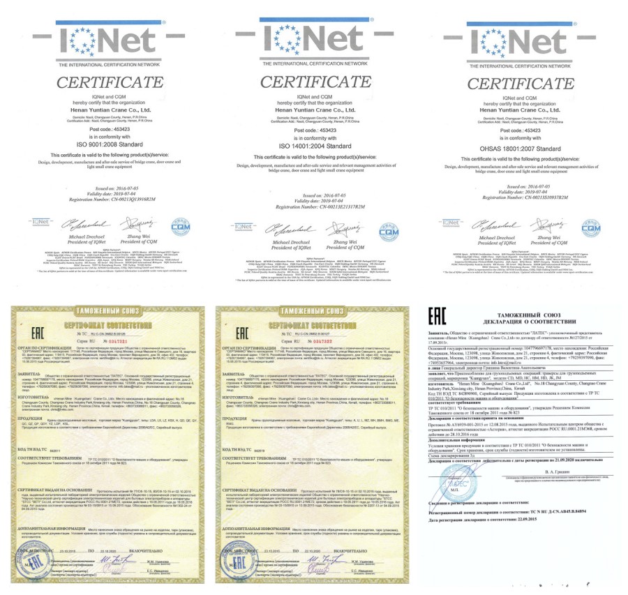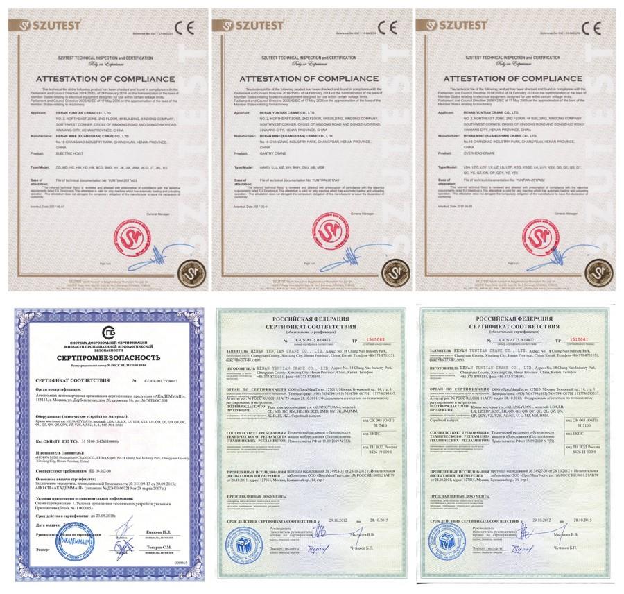 Crane kami telah lulus CE, ISO, GOST, SGS, TUV, BV, dan seterusnya.